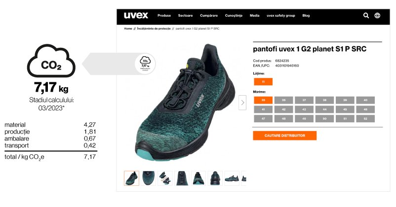 Pentru verificarea independentă a metodei noastre de măsurare și calcularea corespunzătoare a amprentei de CO2, am pregătit un raport de calcul pentru pantoful de siguranță uvex 1 G2 planet. Metoda a fost realizată în conformitate cu ISO 14067, iar raportul a trecut cu succes un audit extern. Am decis să testăm încălțămintea de protecție deoarece acesta este produsul nostru cel mai cuprinzător și complex. Toate produsele sunt calculate în mod similar acestei scheme.